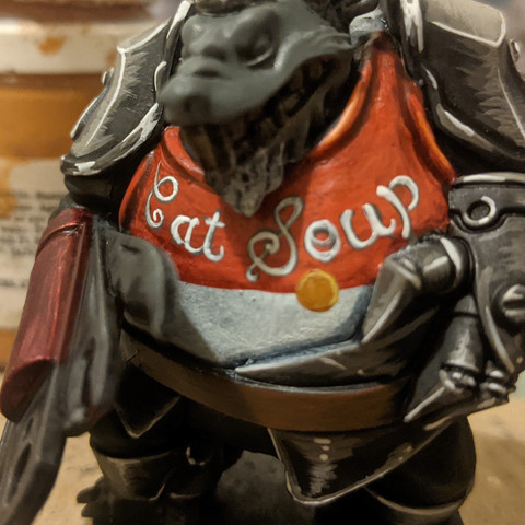 I then added edge highlights to the teeth with Menoth White Highlight and a dot of Morrow White to each eye as a reflection.